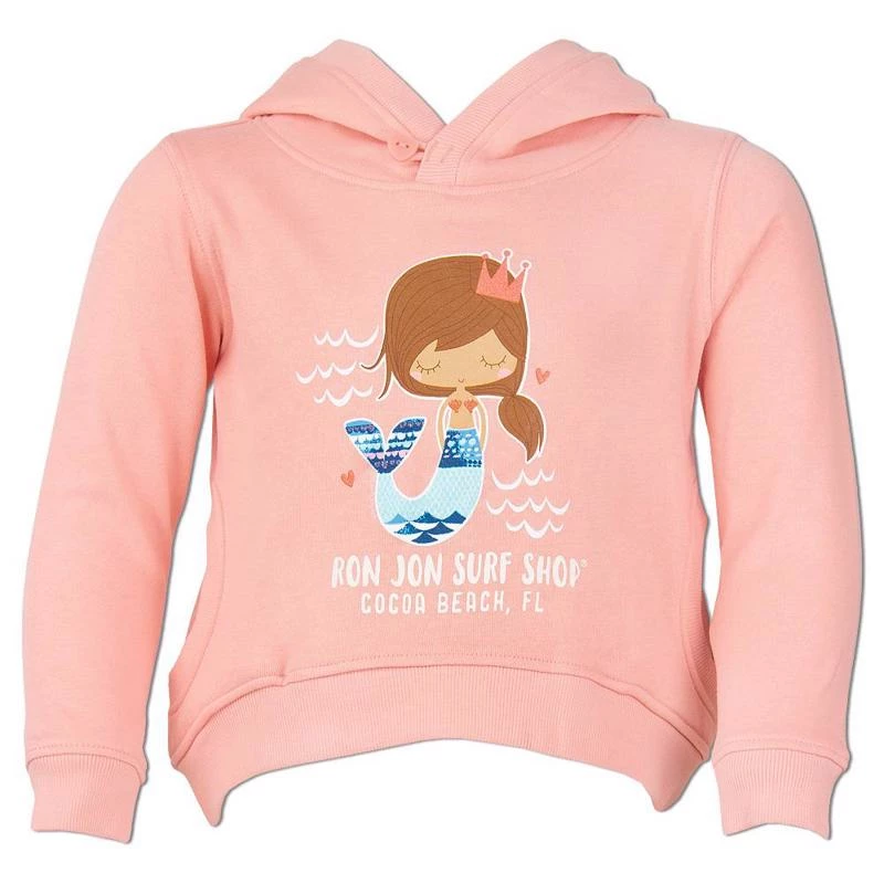 The Earth Nymph Ron Jon Toddler Folk Mermaid Pullover Hoodie features a graphic of a princess mermaid in the water and below her are the words Ron Jon Surf Shop.