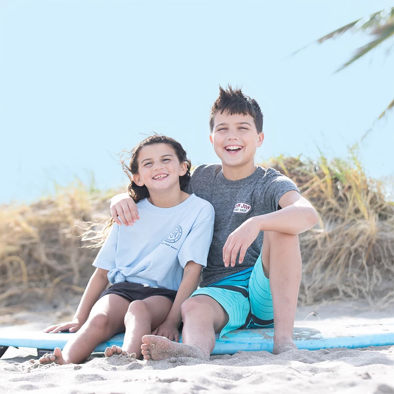 Show your love to animals with the Puppy Love Ron Jon Kids Lifeguard Pup Tee. This shirt features a beach scene with an adorable puppy wearing a Ron Jon lifeguard hat on the beach. Behind the puppy is a sea turtle watching over them from the lifeguard chair.