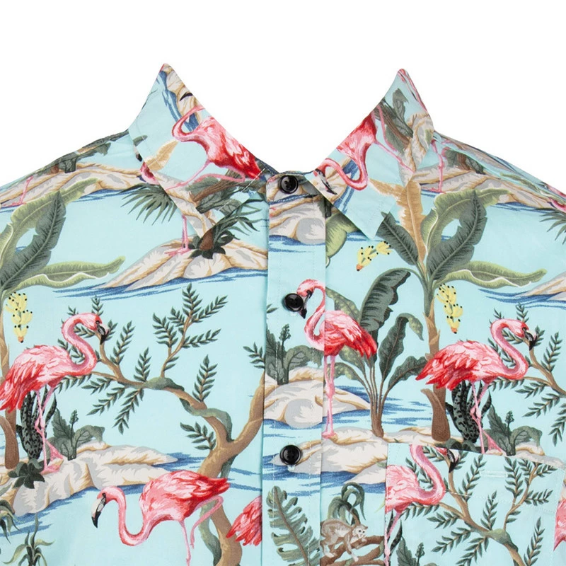 The Ron Jon Flamingo Island Light Mint Shirt is a classic style Hawaiian shirt with a flamingo and foliage print. Two-tone buttons along the full button-up front.