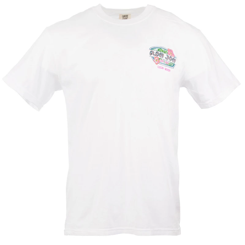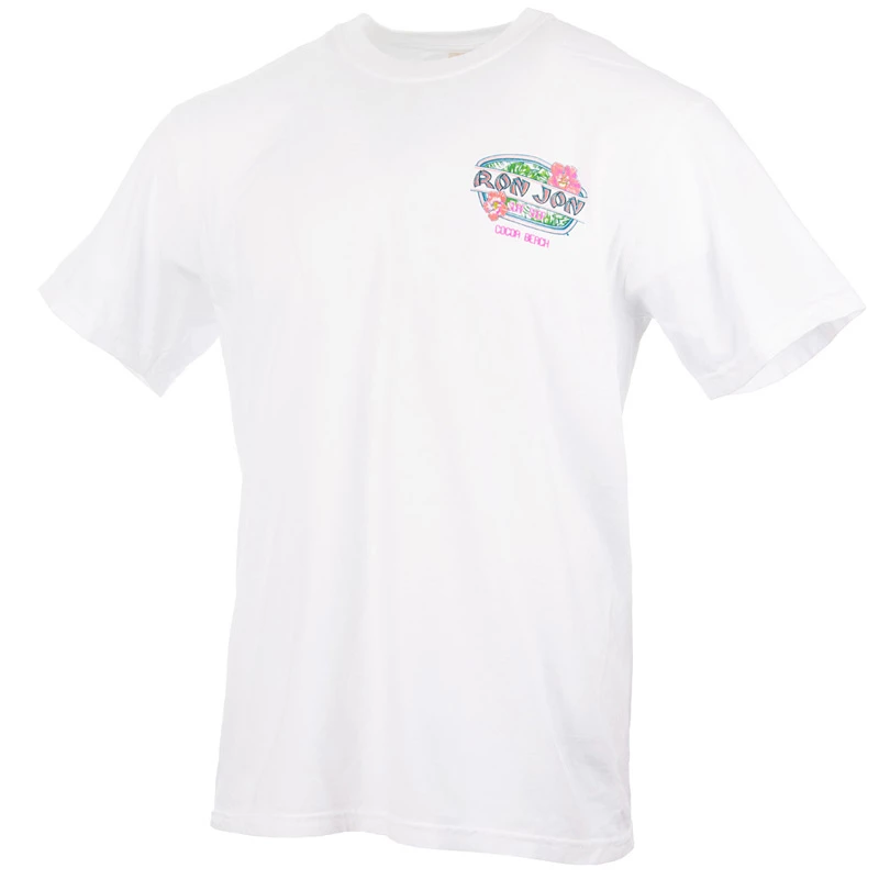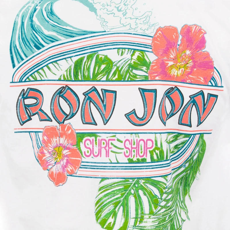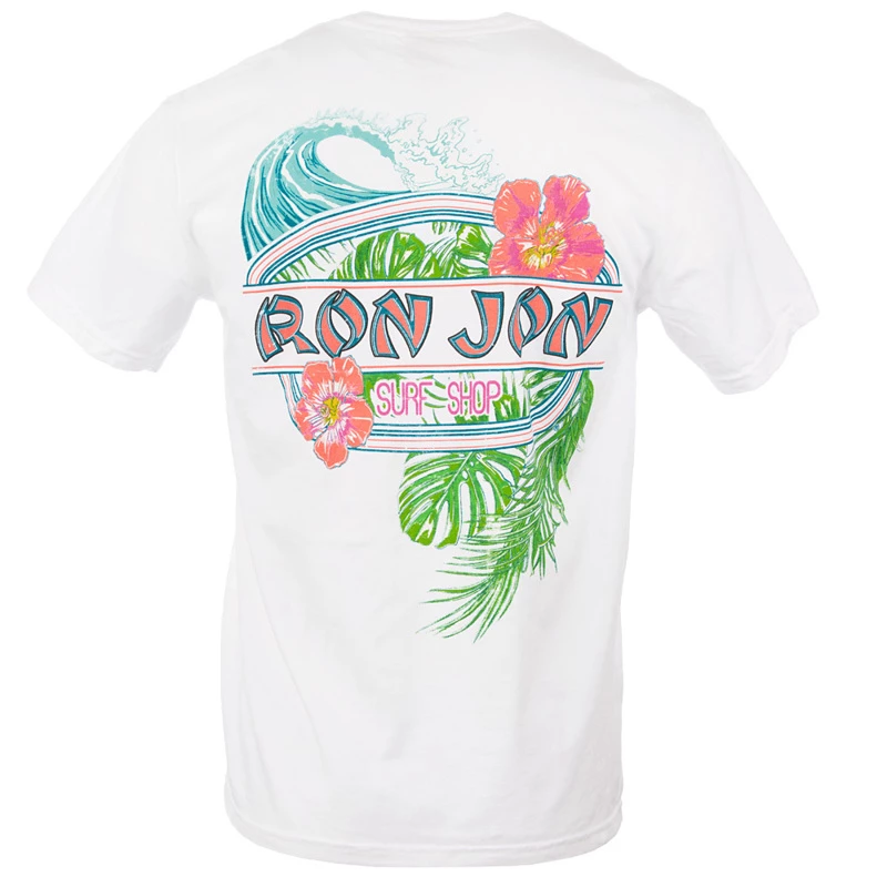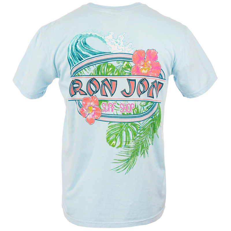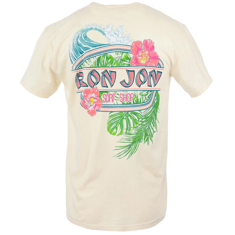 Unisex Ron Jon Surf Shop Floral Surf Tee features a distressed screen print with a wave, hibiscus flowers, palm fronts, and lettering. The design is unique and perfect for the beach vibes