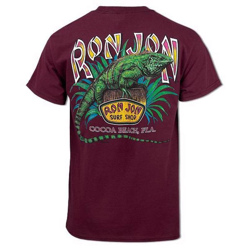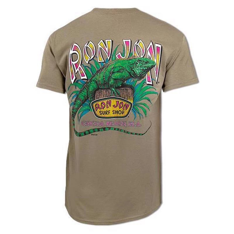 Iguanas can be found in Florida, they can grow up to 6 feet long, and they worship the sun, just like the people that flock to Florida every year for a tropical escape! The Ron Jon Iguana Tee features “Ron Jon” lettering above a green iguana that is perched over a tree trunk and surrounded by palm fronds. Below the iguana is the Ron Jon logo.