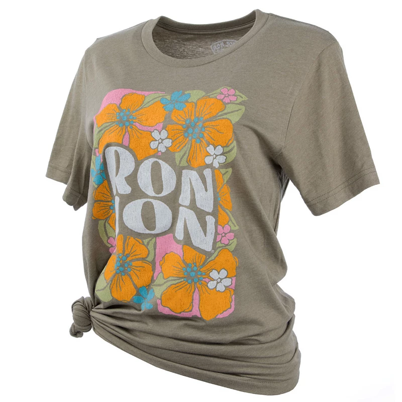 The Ron Jon Junior Groovy Floral Tee features a cute retro-like graphic of pretty tropical flowers tightly compacted around the words Ron Jon.