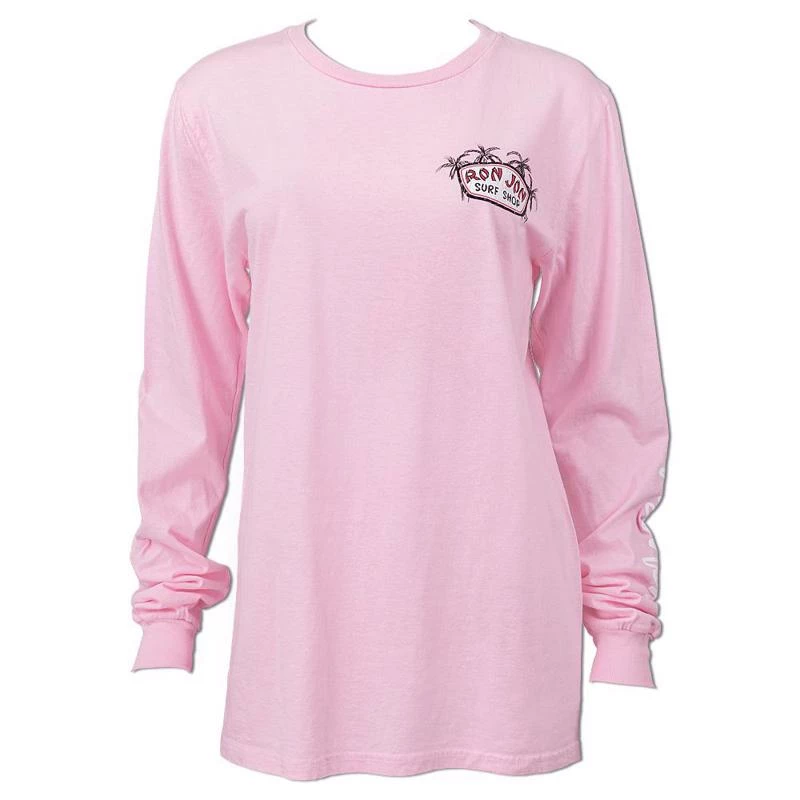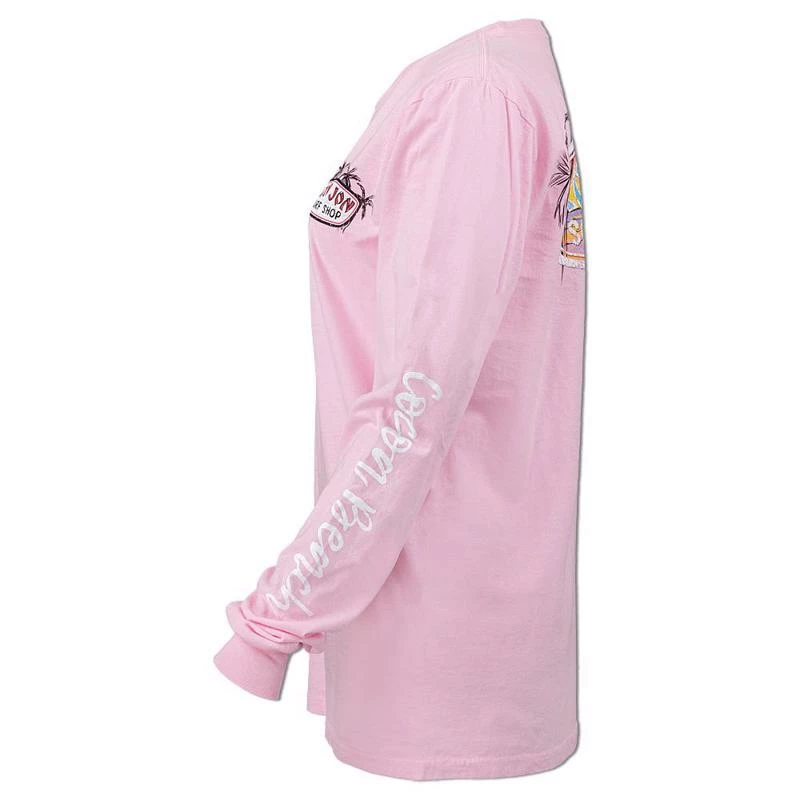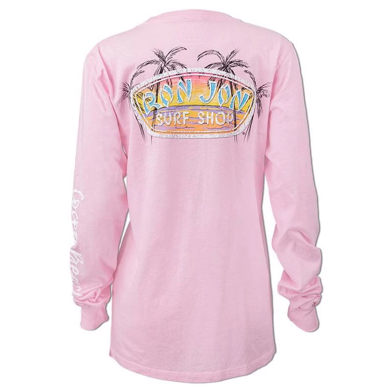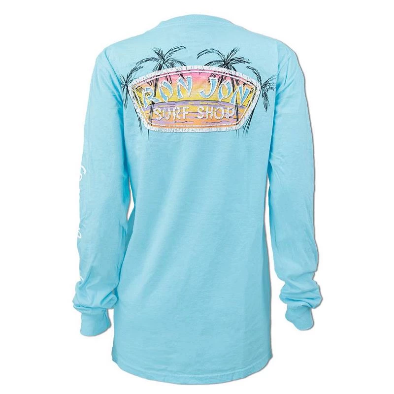 The Ron Jon Junior Sunset Badge Long Sleeve Tee features a distressed back graphic of our famous logo with a beautiful sunset and palm trees.
