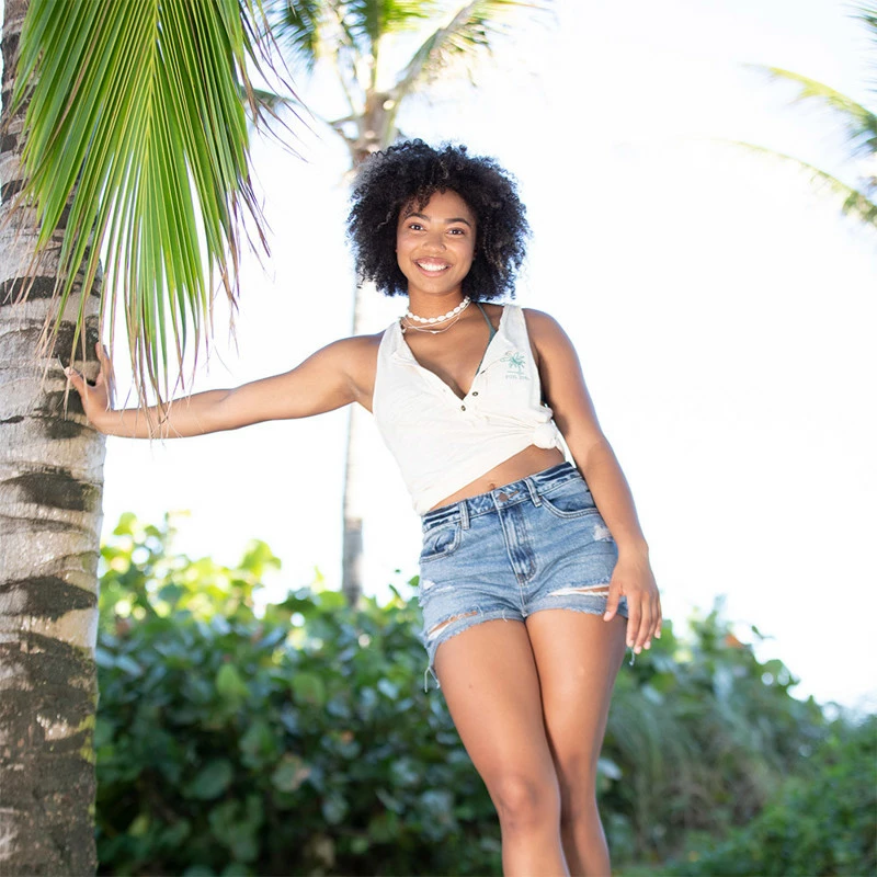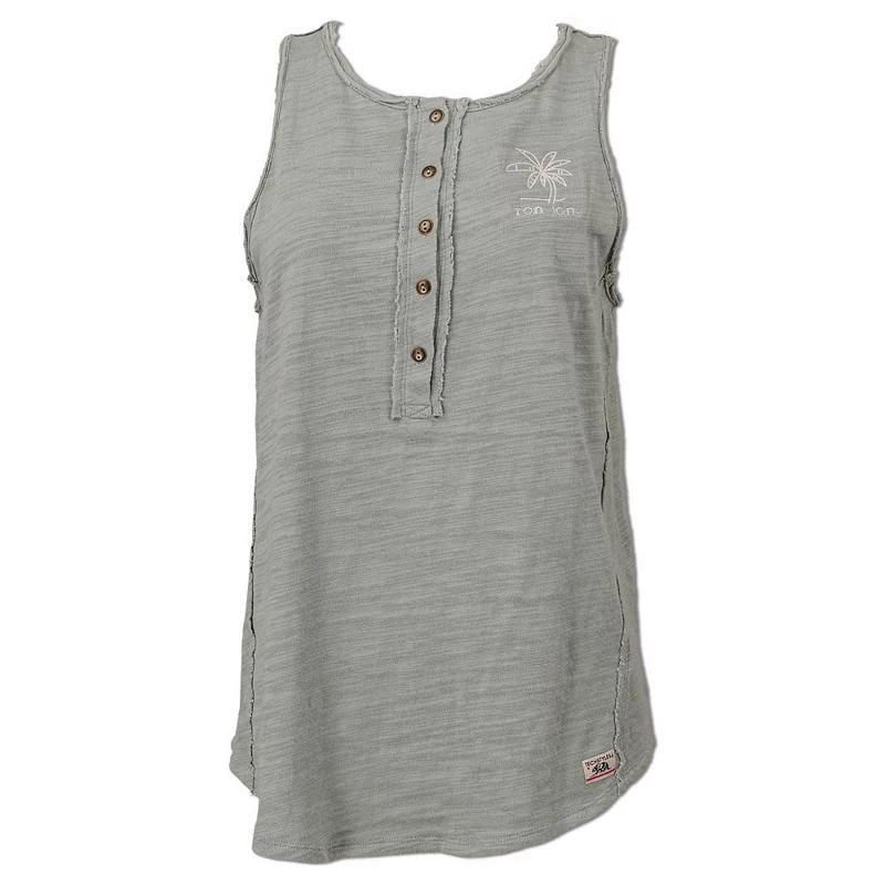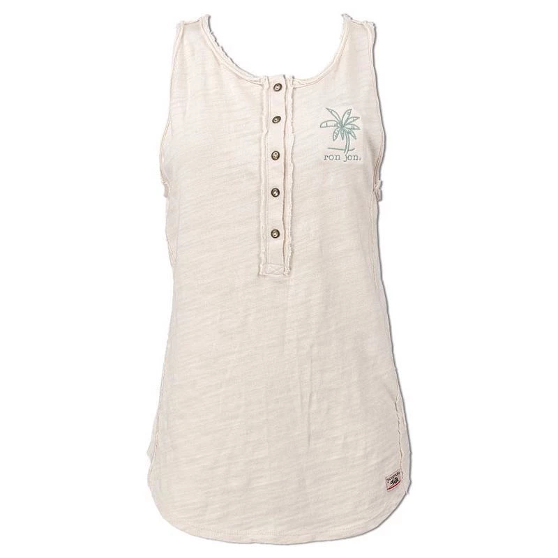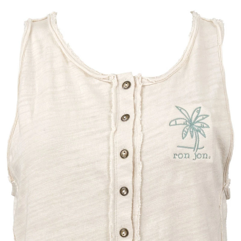 The Ron Jon Juniors Palm Henley Tank is a heavier weight tank with pretty palm tree embroidery and open edge detailing..