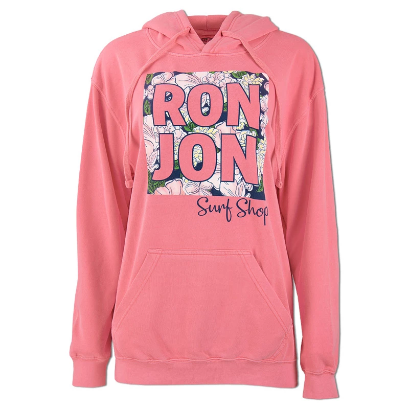 The Ron Jon Juniors Floral Knockout Pullover Hoodie is a vibrant hoodie, perfect for the chilly days in spring. It features the words Ron Jon in bold font with a pretty floral background.