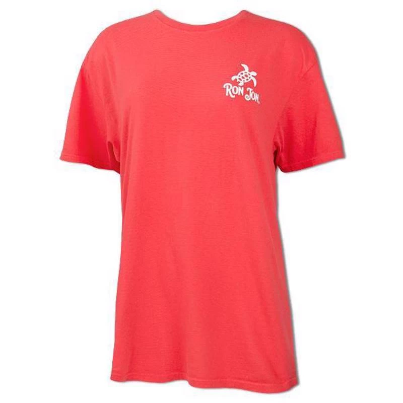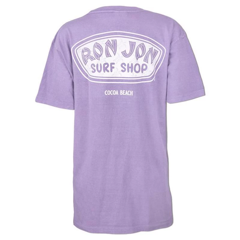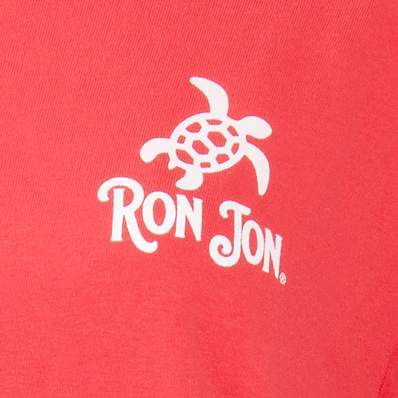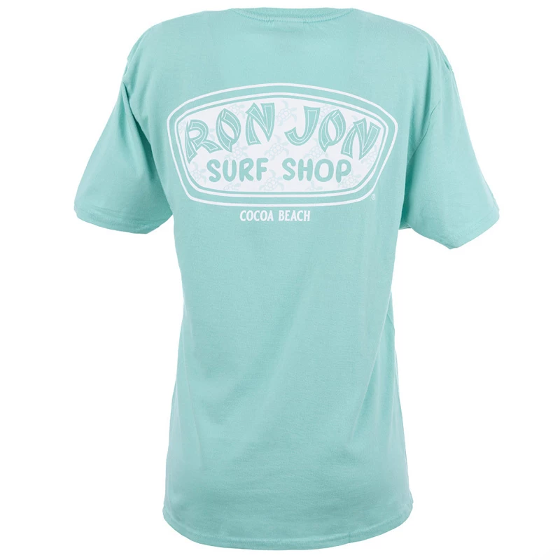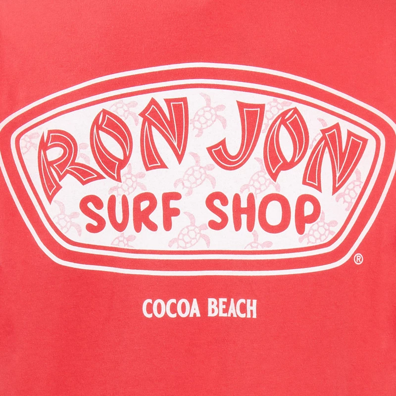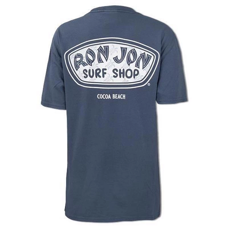 The Ron Jon Juniors Icon Badge Tee features a small white sea turtle on the front and the words Ron Jon. On the back of the shirt is the Ron Jon Trusty Badge filled with little sea turtles.