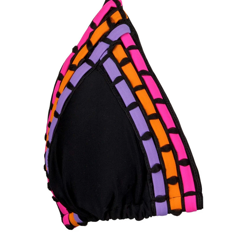 The Ron Jon Juniors Slide Tri Monterrico-Fuego Bikini Top is a standard triangle style bikini top with fixed top point and adjustable base.