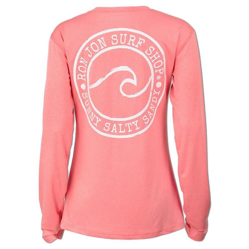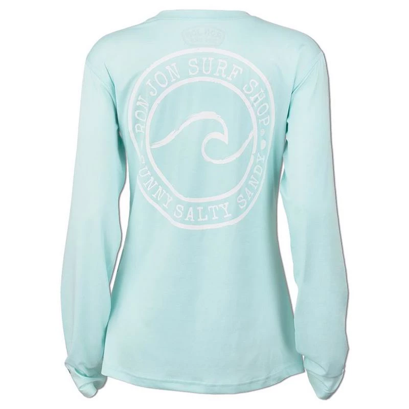 The Ron Jon Juniors Sunny Salty Sandy Long-Sleeve Sun Shirt is a great option as a swimsuit cover-up or as a top to wear while running your daily errands. The performance material offers sun protection with a UPF 50+ rating. Circular graphic with a cresting wave and Ron Jon Surf Shop Sunny Salty Sandy lettering. Large graphic on the back, a smaller version on the front.