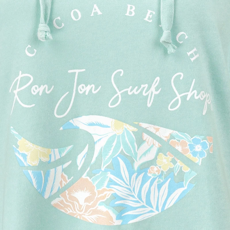 A pastel colored floral screen print graphic adorns the front of this Ron Jon Juniors Tropical Wave Hooded Sweatshirt featuring Cocoa Beach lettering.