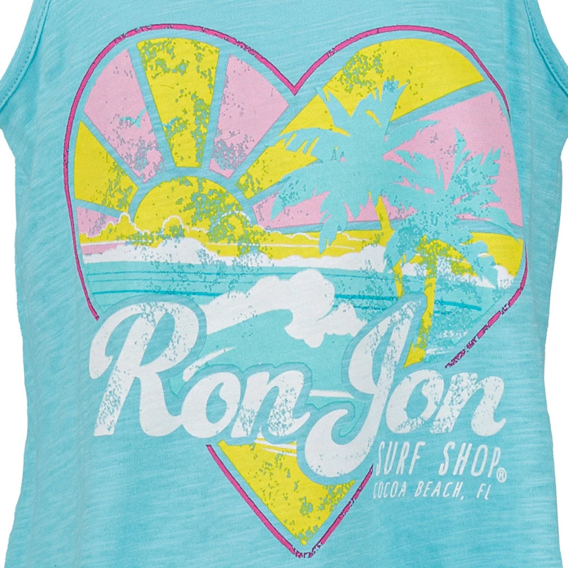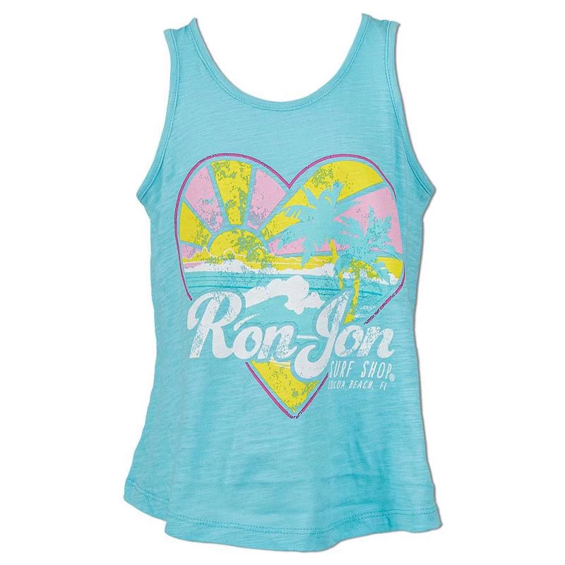 Ron Jon Kids lightweight, burnout Coastal Heart tank top features an ocean scene with a distressed screen print sun, rays, and palm trees.