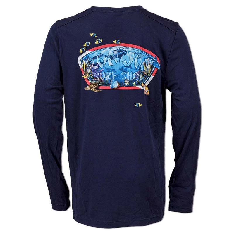 Ron Jon Kids Dive Aquarium UPF 50 Long Sleeve Performance Sun Shirt has a fun fish, diver and turtle graphic. The exceptional performance fabric features wicking technology that transfers moisture three times faster than regular performance tees and offers a UPF rating of 50+ to help protect your kids from harmful solar rays.