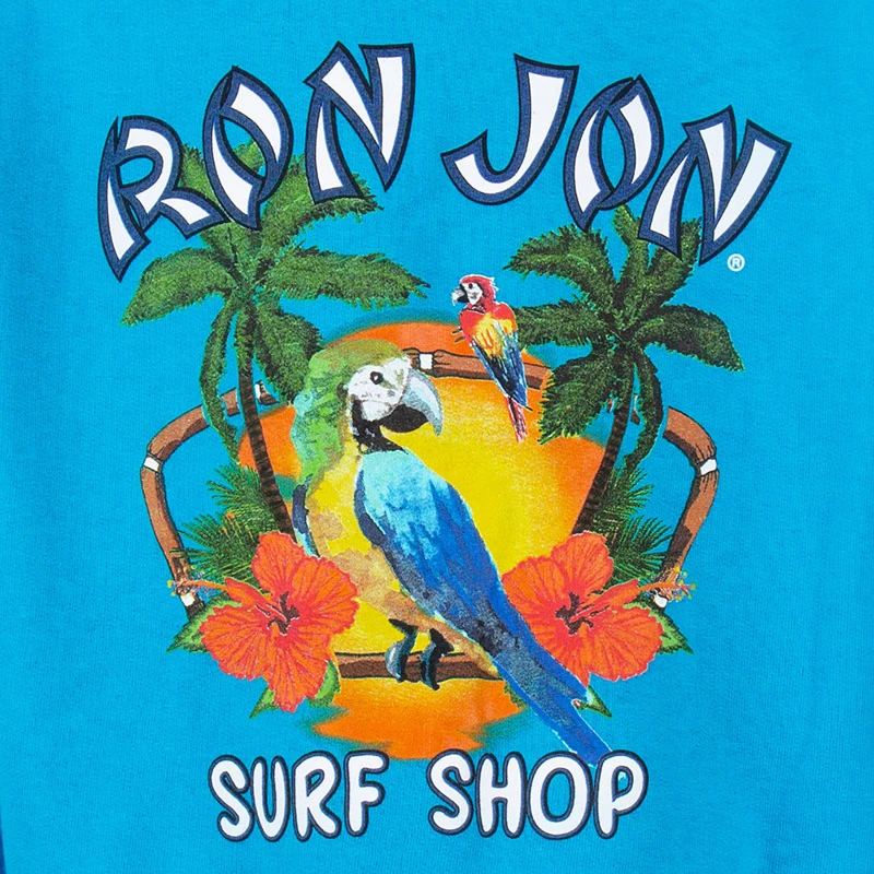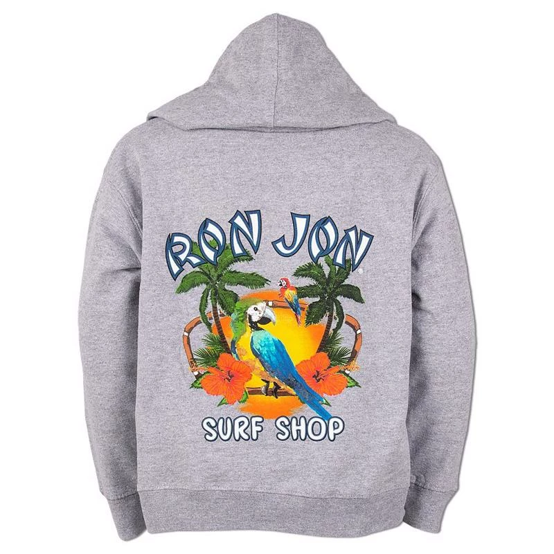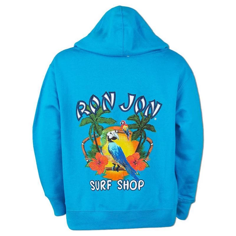 The Ron Jon Kids New Parrot Badge Hoodie is a long-sleeve pull-over hoodie with a back graphic of two parrots sitting in a tropical setting with palm trees at sunset. The front has a small Ron Jon badge logo.