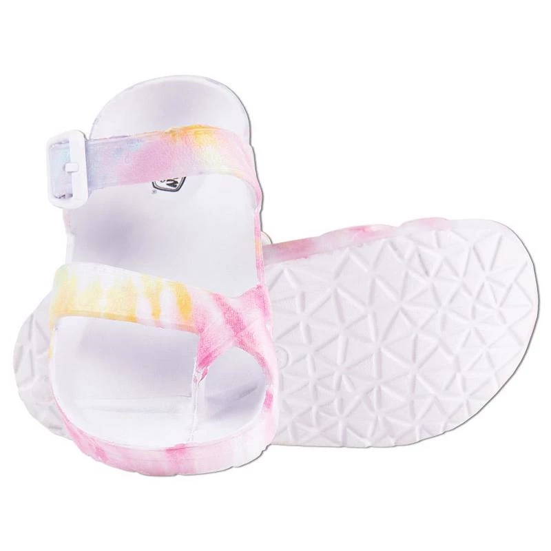 The Ron Jon Kids Reva Pink and White Sandal features one adjustable strap and one fixed strap that is integrated into a toe holder.