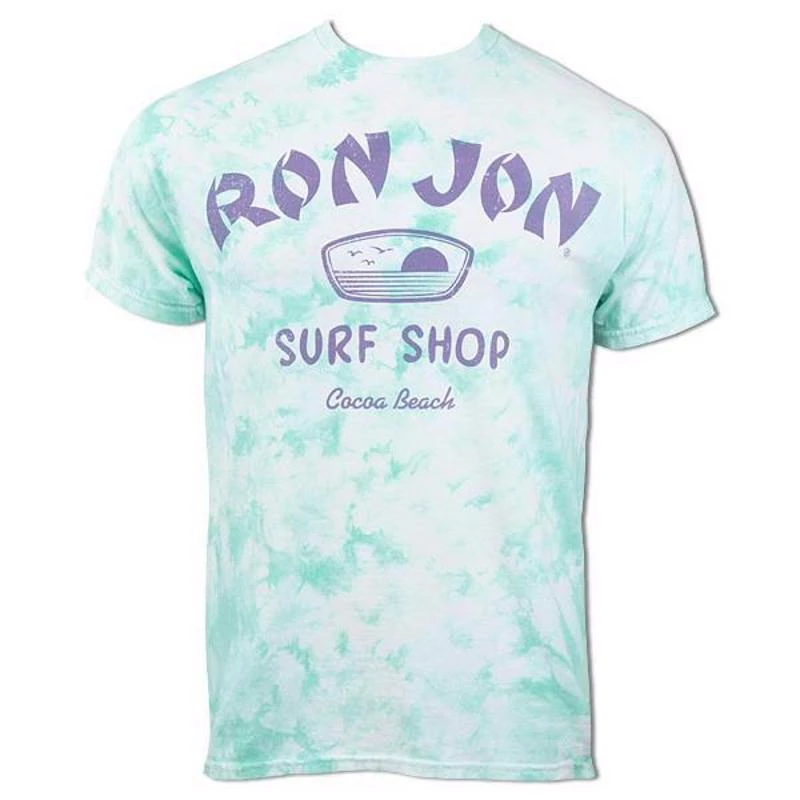 If you love simple clean designs with a pop of color, then the Ron Jon Light Crush Tie Dye Tee is a great option for you! On the front of the shirt is a large graphic of the words Ron Jon Surf Shop Cocoa Beach and a small emblem featuring an image of the sun rising over the ocean with birds flying off in the distance.