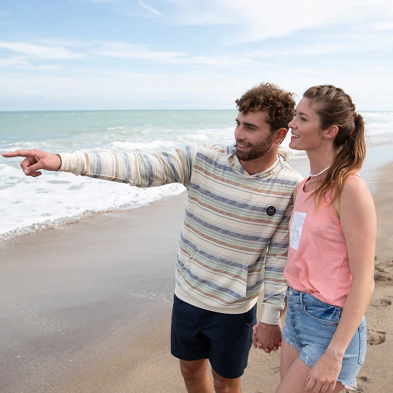 The Ron Jon Stripe Baja Hoodie is a great item to throw on when you go to the beach bonfire, or the backyard fire pit. It’s even good to wear while lounging indoors or running errands. No drawstrings at the hood to worry about and a convenient front pouch pocket.