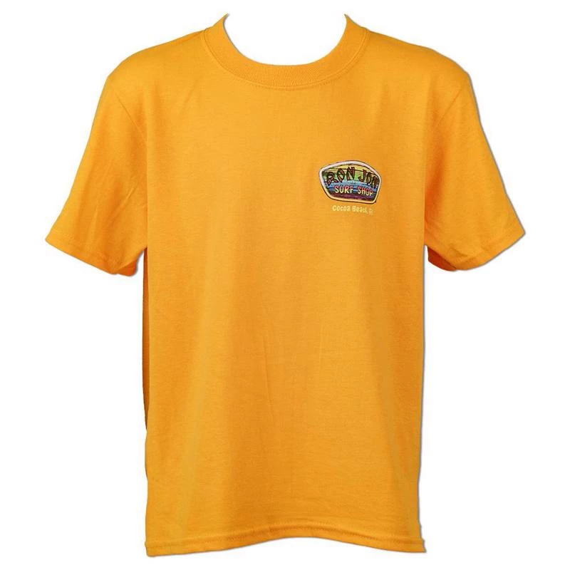 Ron Jon Youth Tiki Tropical Island Tee features a vibrant tiki and palm tree screen print graphic.