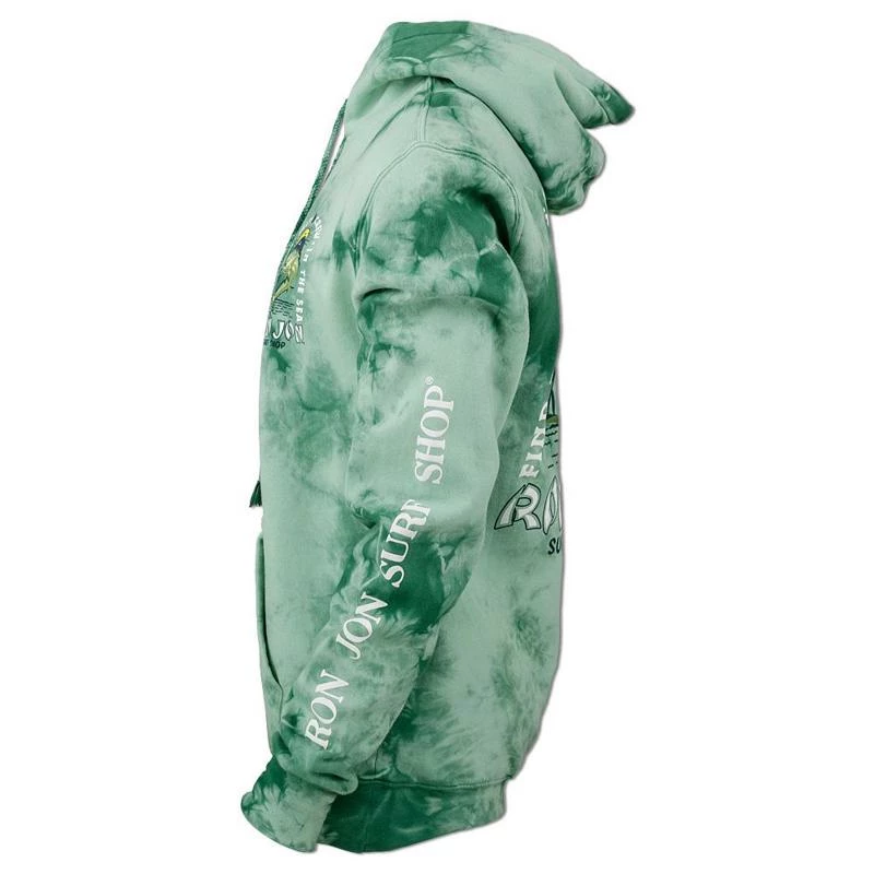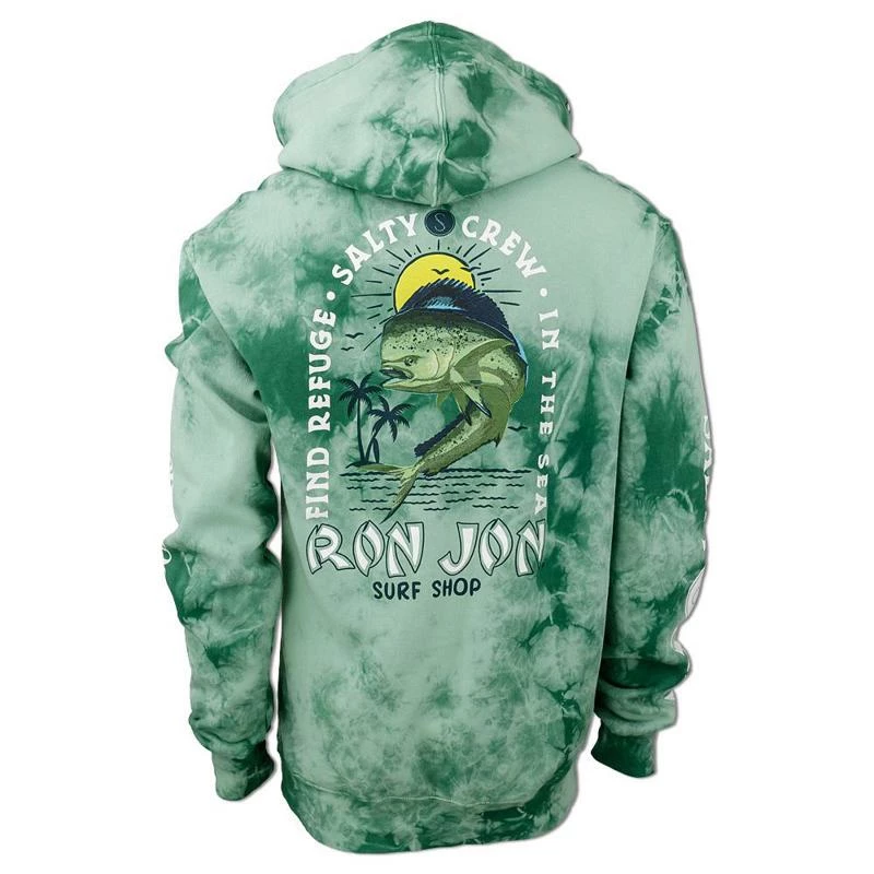 The Mahi Mayhem collaboration pull-over hoodie from Salty Crew and Ron Jon Surf Shop features a large back graphic of a Mahi fish jumping with the sun in the background. Around the graphic is the phrase “Find Refuge In The Sea” as well as both company names. Smaller version on the front. Company names are also printed on the sleeves.