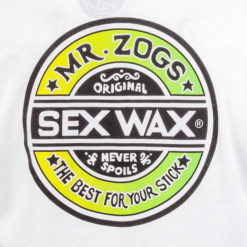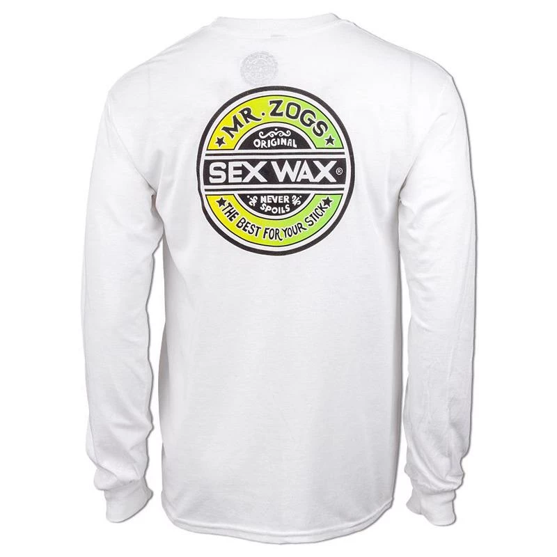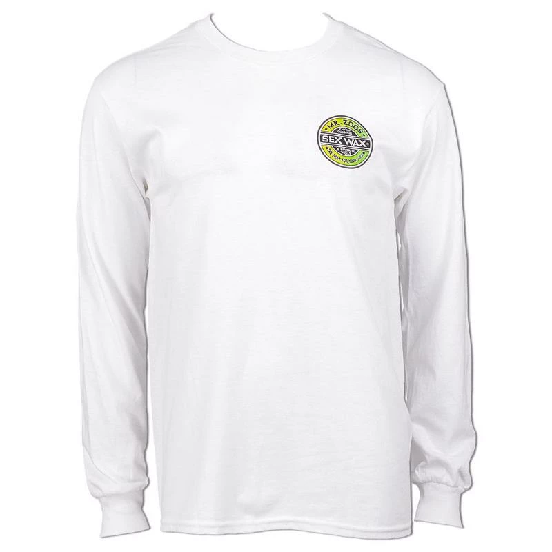 This cotton long-sleeve t-shirt features the famous Mr. Zogs Sex Wax logo with a dual color gradient fade background. Large version on the back, a smaller version on the front. Plain sleeves.